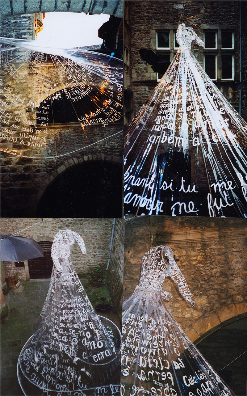 Colloque « Ecritures et Langage » association Asphodèle installation et performance. Installation et création d’un évènementiel de robes sculptures, créations uniques éphémères, réalisées, installée et portées en performance les 2 et 3 avril 2005.