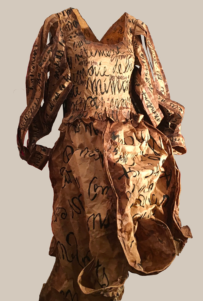 Débusquant le féminin secret, je crée des robes de papier et d’autres matériaux.