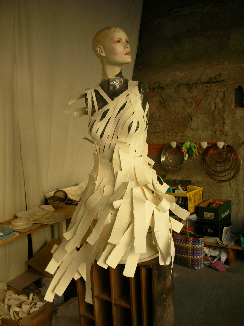 Débusquant le féminin secret, je crée des robes de papier et d’autres matériaux.